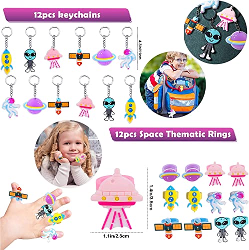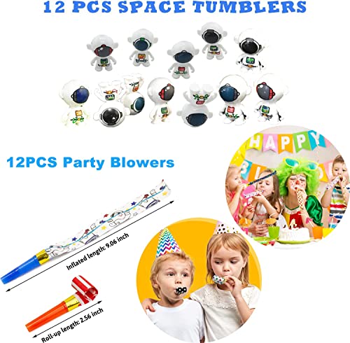 Space Party Favors: Comprend 12pcs sacs de fête spatiale, 12pcs Blowouts noisemaker, 12pcs bracelet à pression spatiale, 12pcs chaîne spatiale fusée pinata, 12pcs jouet gobelet spatial, 12pcs porte-clés fusée, 12pcs anneaux, 12pcs balles rebondissantes et 10pcs tatouage spatial, total 106 pcs space party cadeau pour enfants garçons espace fête d’anniversaire faveur sacs remplisseurs.