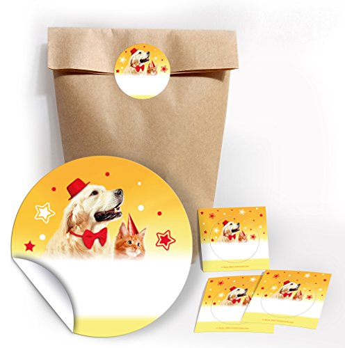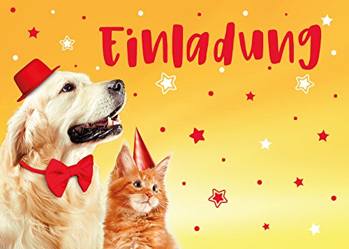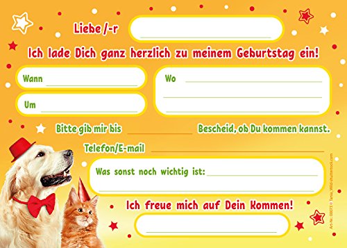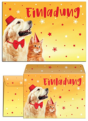 12 cartes d’invitation colorées + 12 enveloppes + 12 sachets de fête avec 12 autocollants pour anniversaire avec motif chien et chat