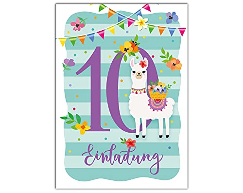 Specification: JuNa-Experten Lot de 12 cartes d’invitation pour 10e anniversaire d’enfant Lama 12 enveloppes incluses 12 sachets…