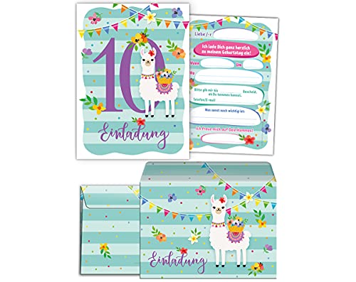JuNa-Experten Lot de 12 cartes d’invitation pour 10e anniversaire d’enfant Lama 12 enveloppes incluses 12 sachets…