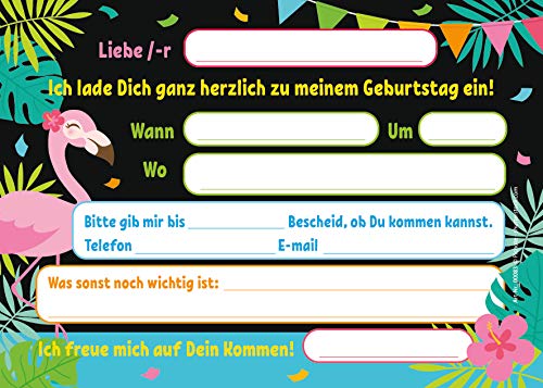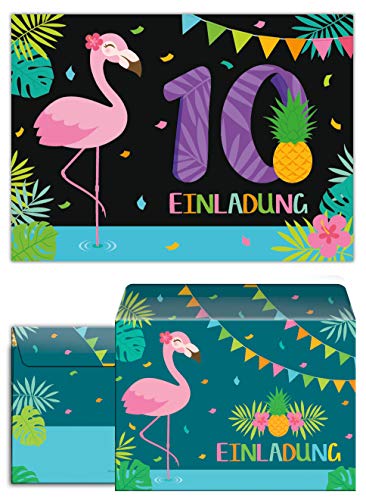 Junaversum Lot de 12 cartes d’invitation pour 10e anniversaire d’enfant Motif flamant rose + 12 enveloppes + 12 sachets…