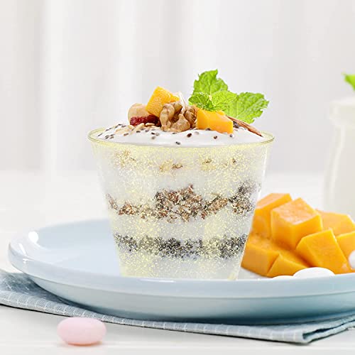 Specification: KAHEIGN 60 Pièces Paillettes d’or Gobelets en Plastique, 270ml Coupes à Dessert Rondes Coupe Apéritif Parfait Clair…