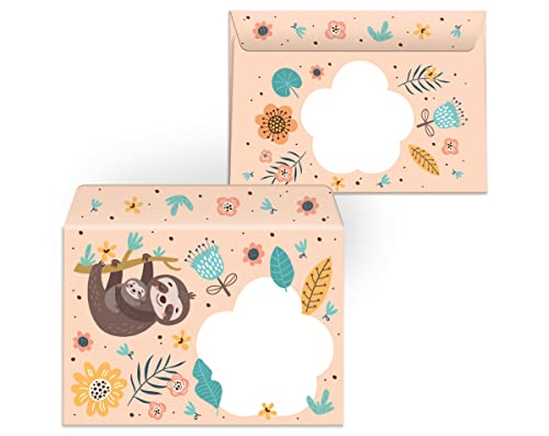 Dimensions : la carte a une taille de 10,50 cm x 14,80 cm, impression photo 300 g/m² et est finie avec un vernis UV brillant. L’enveloppe a une taille de 11,40 cm x 16,20 cm, impression de 80 g/m² et est autocollante (avec bande déchirable). Les sacs ont une taille de 14 x 22 cm. Les autocollants mesurent 5,2 x 14,8 cm.