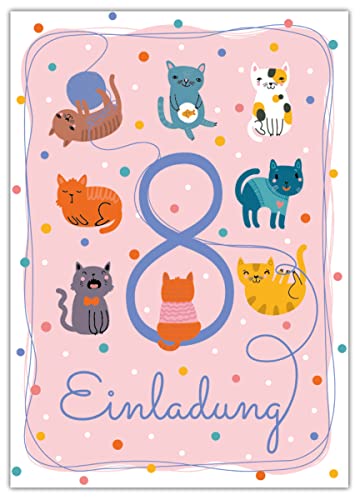 Lot de 12 cartons d’invitation pour 8e anniversaire d’enfant avec 12 enveloppes et 12 sachets Motif chat