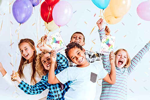 Specification: 12 cartes d’invitation avec des paillettes pour les anniversaires et les fêtes d’enfants – Les cartes au design licorne…