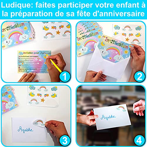 🌈Ludique, faites participer votre enfant à la préparation de sa fête d’anniversaire : elle s’amusera à compléter les cartes pré remplies, les glissera dans les enveloppes blanches et les personnalisera grâce à la planche des stickers autocollants 🌈
