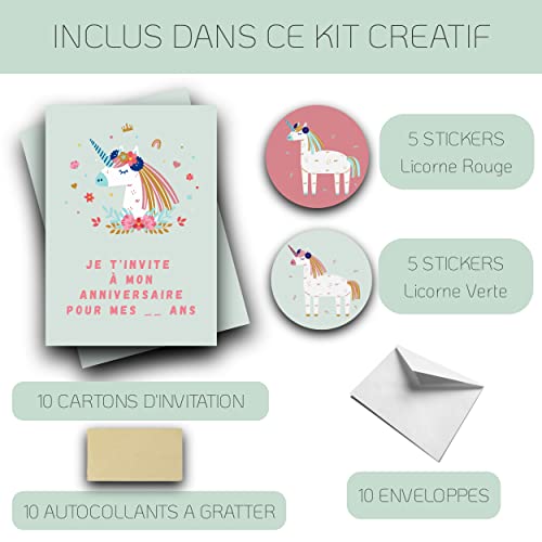 NOUVEAUTE KIT CREATIF DE 10 CARTES D’INVITATION ANNIVERSAIRE A GRATTER THEME LICORNES EN FRANCAIS CONTENANT: 10 CARTONS…