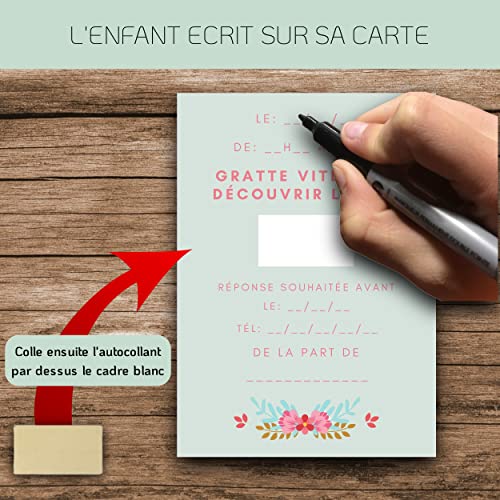 🧒L’ENFANT PEUT PARTICIPER A LA PREPARATION DE SON ANNIVERSAIRE 🦄: Il pourra facilement compléter pour remplir les informations dans les champs de texte, coller les autocollants sur les enveloppes pour les personnaliser, écrire le prénoms des ses copains et copines dessus, coller les autocollants à gratter. Grace à ce concept, une simple carte d’invitation se transforme en une activité manuelle.