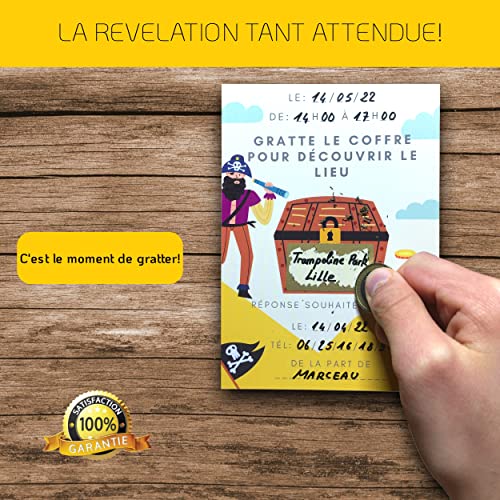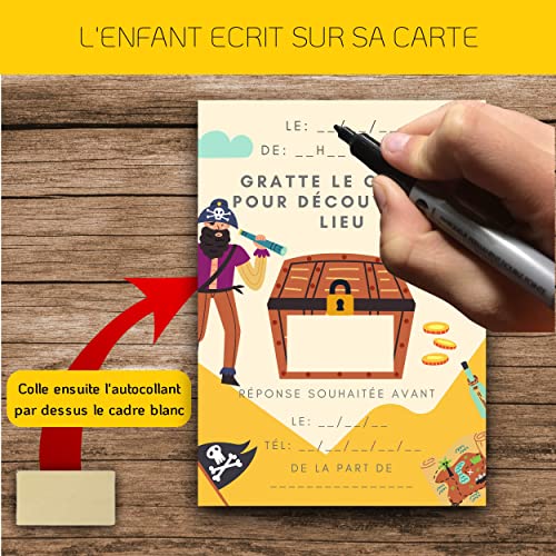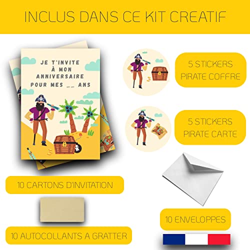 🧰 KIT CREATIF TOUT INCLUS 🏴️: 10 cartons d’invitation sur le thème Pirates, associés à 10 enveloppes, 10 stickers Pirates ( 5 Pirates avec Carte au trésor et 5 Pirates avec Coffre au trésor) à coller sur celles-ci ainsi que 10 autocollants à gratter pour dissimuler le lieu.