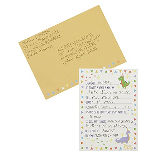 Utilisez ces jolies cartes pour inviter votre famille et vos amis à la fête d’anniversaire de vos enfants, et faites des économies. Ce lot comprend 24 cartes et les enveloppes correspondantes pour un envoi facile. Ces cartes représentent un mignon dinosaure vert sur fond jaune avec “Invitation” inscrit au recto et de l’espace pour remplir les informations telles que le lieu, la date et l’heure au verso, ce qui les rend idéales pour une fête d’anniversaire. Chaque carte mesure 10,5 x 14,8 cm, soit l’équivalent du format A6.