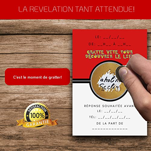 🧰 KIT CREATIF TOUT INCLUS 🧙‍♂️: 10 cartons d’invitation sur le thème POKEMON associés à 10 enveloppes, 10 stickers invitation à coller sur celles-ci ainsi que 10 autocollants à gratter pour dissimuler le lieu.
