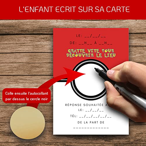 🧒L’ENFANT PEUT PARTICIPER A LA PREPARATION DE SON ANNIVERSAIRE 🧹: Il pourra facilement compléter pour remplir les informations dans les champs de texte, Personnaliser les autocollants en faisant les yeux le nez et la bouche et ensuite coller sur les enveloppes pour les personnaliser, écrire le prénoms des ses copains et copines dessus, coller les autocollants à gratter. Grace à ce concept, une simple carte d’invitation se transforme en une activité manuelle.
